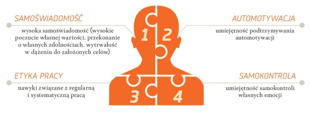- samoświadomość (wysokie poczucie własnej wartości, przekonanie o własnych zdolnościach, wytrwałość w dążeniu do założonych celów),